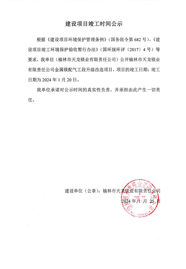 天龍鎂業(yè)金屬鎂2.25萬(wàn)噸、蘭炭50萬(wàn)噸驗(yàn)收公示